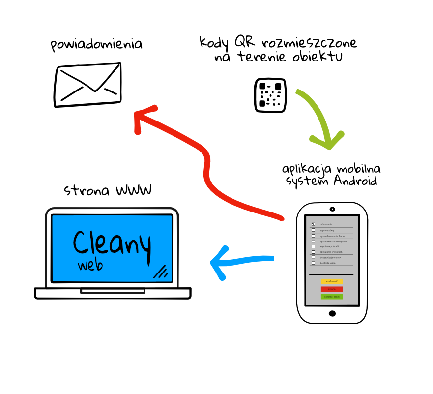 Składa się ona ze strony WWW oraz aplikacji mobilnej wraz z pakietem kodów QR. Kody QR służą jako "punkty nawigacyjne" rozmieszczone w różnych punktach sprzątanych powierzchni. Dzięki ich wczytywaniu możemy śledzić postępy prac.